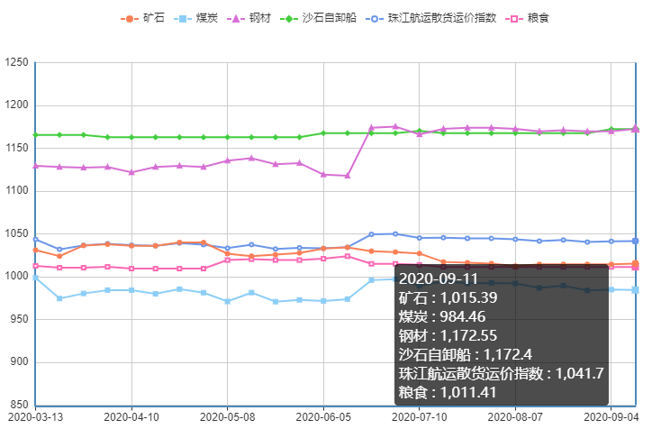 钢材航线方面,“金九银十”传统销售旺季即将来临,本期南沙-九江航线出货有所增加,运价指数环比上涨1.311%,带动钢材航线运价指数整体上涨0.242%。