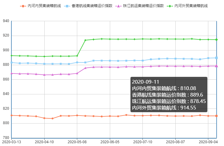 本期内河外贸航线运价指数有所回落,环比下跌0.019%。本期江门-深圳西、中山-深圳西、中山-南沙、肇庆-深圳西、江门-南沙、珠海-深圳西、南沙/黄埔-深圳西、黄埔-南沙、贵港-深圳西等航线运价指数有所回落,其中以贵港-深圳西环比跌幅0.106%最大。