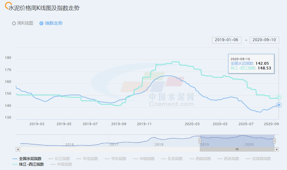 进入九月全国市场行情有所好转,大部分地区需求环比有小幅提升,全国均价环比小幅上涨。受周边福建地区水泥价格回涨带动,9月1日起广东梅州、汕头、汕尾、揭阳等粤东市场水泥价格普涨10元/吨,主要企业进行下半年首次尝试性上调。粤北及珠三角地区周内略有阴雨,但对需求影响不大,八月下旬熟料价格回涨20元/吨后,水泥价格也有走高预期。