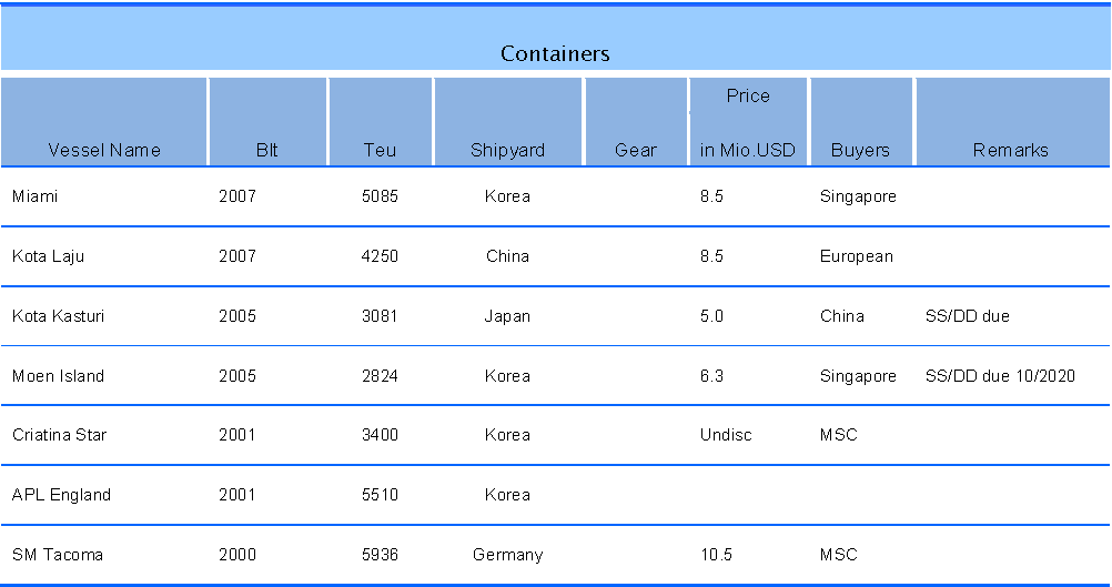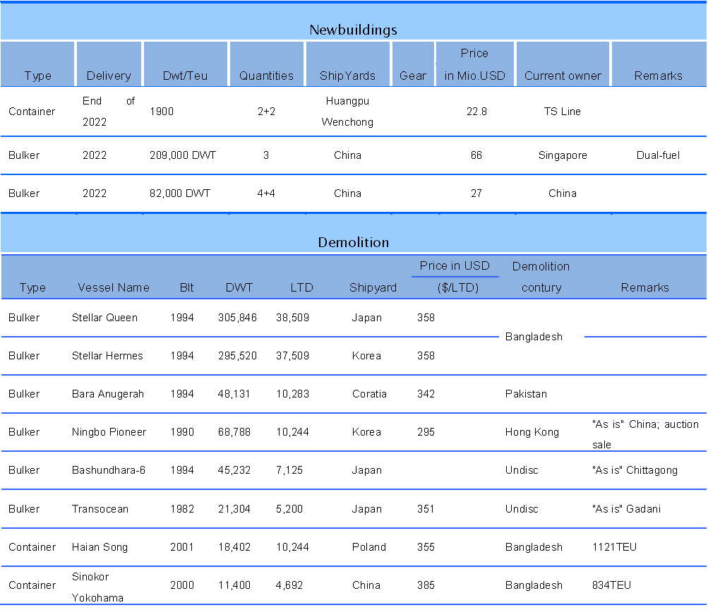 拆船市场在最近几天完成了大量交易。大多数散装货船的拆船价格在350美元/ 轻吨左右或以上。尽管集装箱船市场正在复苏,但上周依然看到两艘支线船以355-385美元/ 轻吨的价格在孟加拉国送拆,分别是“Haian Song” (10244LDT,1121TEU, 2001 Poland)以355美元/轻吨成交,“Sinokor Yokohama”(4692LDT,832TEU,2000 China)拆得385美元/轻吨的价格。(其他成交及详细信息请见下页成交表格)