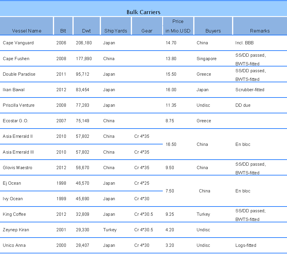 散货船方面:BDI指数在近几周有明显的跌势,但是二手船成交方面似乎尚未波及。上周我们依然录得了可观的成交数据。Capesize型船“CAPE FUSHEN” (206,180 DWT, 2006Japan)以1380万美元转手予新加坡船东BergeBulk;“Crown 58" supramaxes型船“Asia Emerald II”和“Asia Emerald III”以1650万美元的价格打包出售给了中国船东;handysize型船“KING COFFEE“(32,809 DWT, 2012 Japan),压载水装置已安装,最终以925万美元售出。