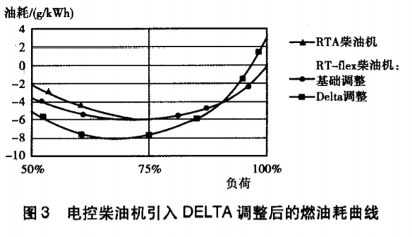 另外RT—flex柴油机利用其参数调整的灵活性而特别引入了DELTA调整,在柴油机海上航行时,在排放、油耗上做到很好的平衡 ,既保证了排放满足规范要求,又降低了总运行成本,见图3。
