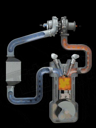 通过增压器将空气压入发动机气缸内,大大增加了柴油机的进气量,保证了更多的燃油在气缸内的完全燃烧,提高了柴油机的工作效率,柴油机排出的废气能量能降低有害气体的产生,满足了柴油机工作的经济性和节能环保的要求。