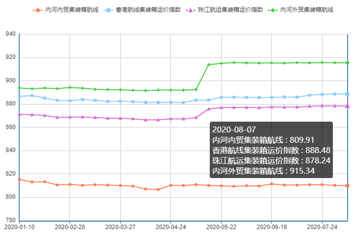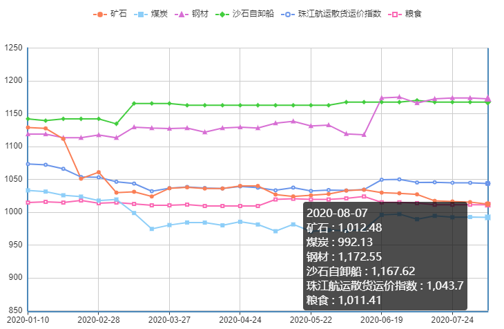 南方持续高温天气,煤炭需求不减,但据了解,由于非煤运力加入,本期煤炭市场运力较为宽松,船东议价空间有限,部分航线运价下调,煤炭航线运价指数有所回落,环比跌幅为0.056%,其中珠海-贵港、南沙-江门、虎门-佛山、珠海-佛山、南沙-佛山等多条航线运价指数均有所下跌,以珠海-贵港航线运价指数跌幅1.201%最大。