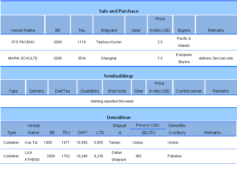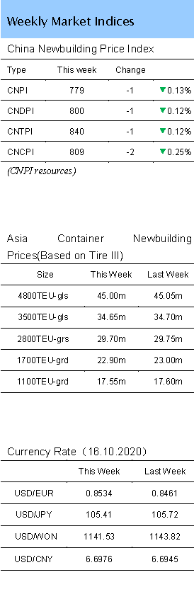 无新签订单。现存订单动态,黄埔文冲船厂为韩国长锦商船建造的1080TEU集装箱船H5580/H5581于10月18日开工。该系列船合同共签订并生效了4艘,该船型船长147.9米,型宽23.25米,设计吃水7.3米,为绿色环保型节能型集装船,配备了开式脱硫塔设备。另有,江南造船为马士基航运有限公司建造的5艘2200TEU支线型系列集装箱船的首制船“NAKSKOV MÆRSK”(H2640)于近日顺利下水。该系列2200TEU支线集装箱船总长172米,型宽32.2米,最大载箱量2288TEU,其中包括396TEU冷箱及100个备用冷箱位,全船货舱配备水喷淋系统,并设置3台40吨克令吊。