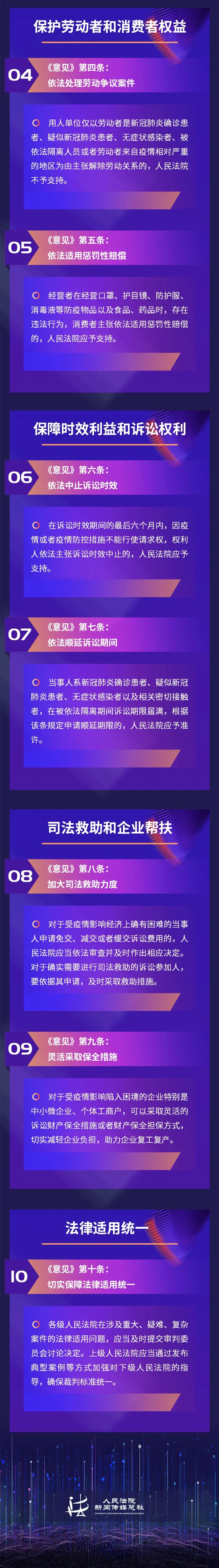 三是注重对劳动者和消费者权益保护。为依法保障劳动者公平就业等合法权益,《意见》提出,用人单位仅以劳动者是新冠肺炎确诊患者、疑似新冠肺炎患者、无症状感染者、被依法隔离人员或者劳动者来自疫情相对严重的地区为由主张解除劳动关系的,人民法院不予支持。为保护消费者合法权益,《意见》明确,消费者依照相关法律规定主张适用惩罚性赔偿的,人民法院应予支持。