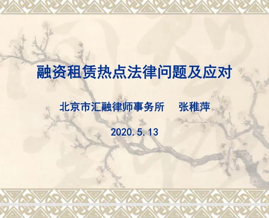 张律师以“融资租赁热点法律问题及应对”为题,分四个部分进行讲授。她在第一部分解读了《民法典》编纂中关于融资租赁方面的改革趋势,重点分析了设立担保统一登记、融资租赁定性等热点问题;在第二部分,她讲解了最高人民法院《九民纪要》中涉及的重点问题,分析了其对融资租赁业务的影响;第三部分,张律师介绍了当前疫情对融资租赁存在的一定不利影响;她在第四部分重点介绍了严监管背景下融资租赁业务的出路,讲解了公益性资产能否作为租赁物这一热点问题。在分析中央和地方金融监督条例后,她表示,要正确理解严监管背景,租赁行业将被赋予更高的社会公信力。