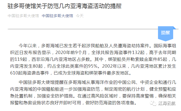 今年以来,多哥海域已发生若干起涉我船舶及人员遭海盗劫持案件。国际海事组织近日发布报告显示,2020年前9个月,全球共报告海盗事件132起,高于去年同期的119起,西非沿海几内亚湾地区占多数。其中,绑架船员并勒索赎金案件85起,几内亚湾发生80起,约占全球此类案件的95%。2002年以来,几内亚湾地区累计发生610起海盗袭击事件,已成为全球海盗和绑架事件最多发地区。