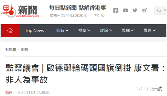 11月4日的香港《点新闻》称,有读者投诉香港启德邮轮码头的旗杆上有一幅国旗倒挂,有侮辱国旗之嫌。对此,香港康乐及文化事务署(简称康文署)回应称,是悬挂国旗的挂钩破损,使旗帜松脱引起倒挂,并非人为事故。