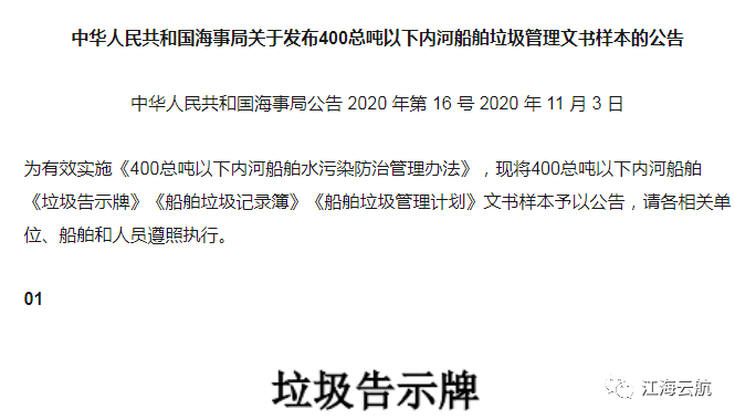9、中国海事局发布400总吨以下内河船舶垃圾管理文书样本;