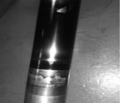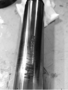 记录显示4#缸柱塞和套筒检修后使用时间为2477 h,柱塞有较深摩擦痕迹( 见图3) ,受损部位在套筒内部润滑油槽与漏油泄放油槽之间。