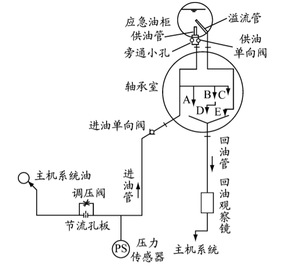 应急油箱正常工作时,主机系统油通过进油单向阀向增压器轴承室供油,另一路经过关闭状态供油单向阀的旁通孔向应急油箱补油。