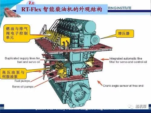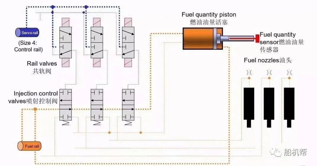主机的定时功能由角度编码器和E90: COM-EU、E95:CYL-EU 控制各共轨电磁阀完成,燃油喷射的动力由2台机带液压泵供油的伺服油共轨液压系统提供。