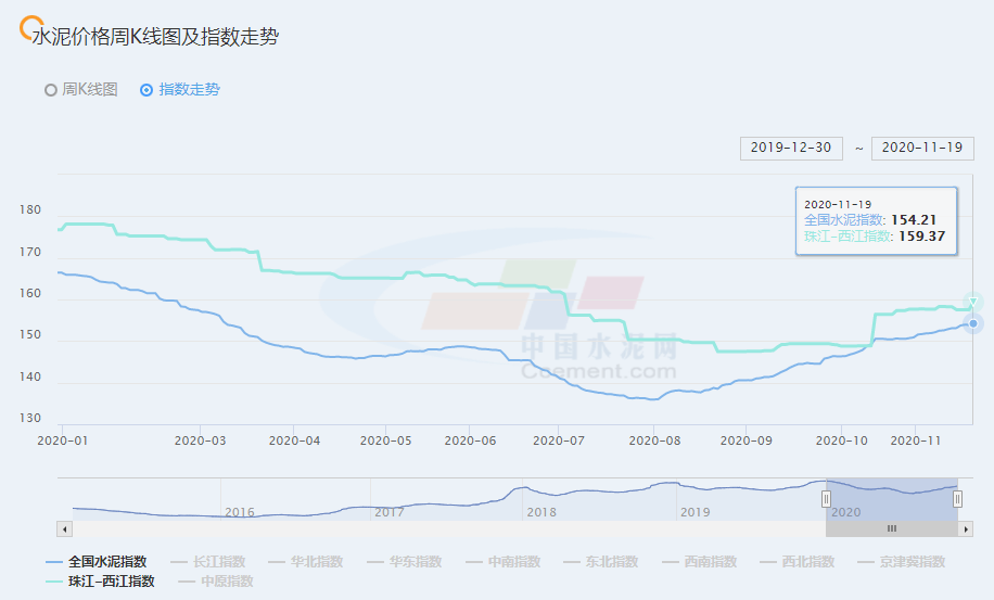 图5 全国以及珠江-西江水泥价格指数走势。数据来源:水泥研究院