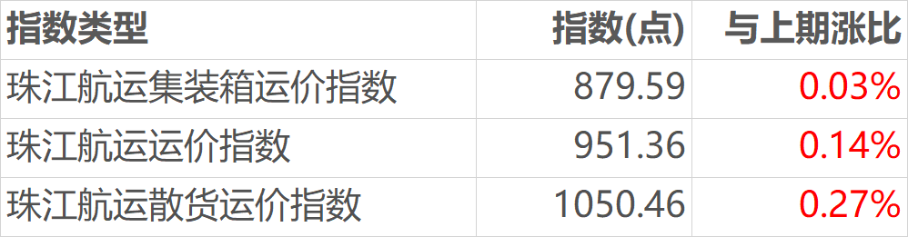 矿石方面,本期贵港-南沙水泥航线运价最高涨幅达到10元/吨,指数环比涨幅为5.189%,带动矿石航线运价指数上涨1.46%。