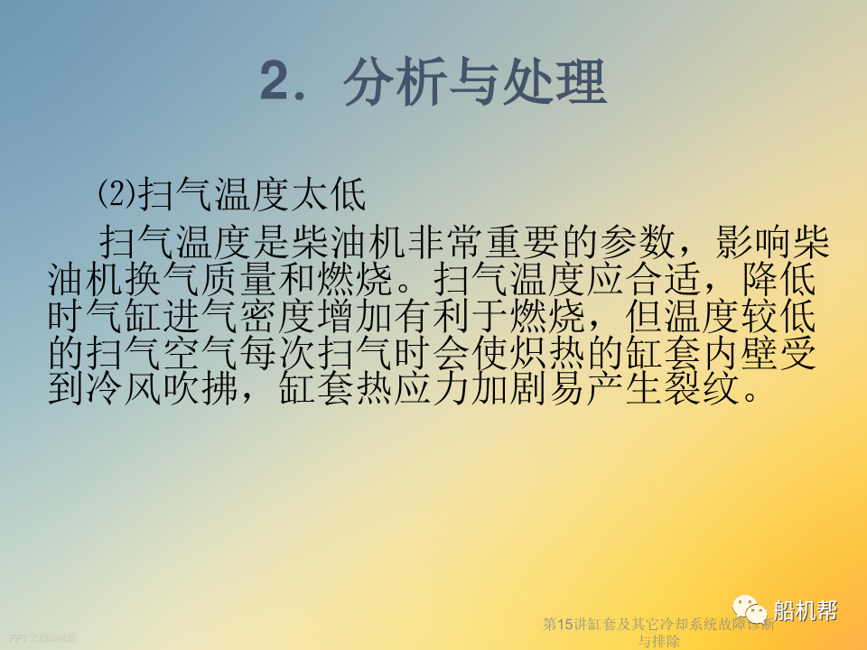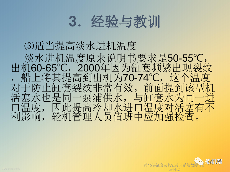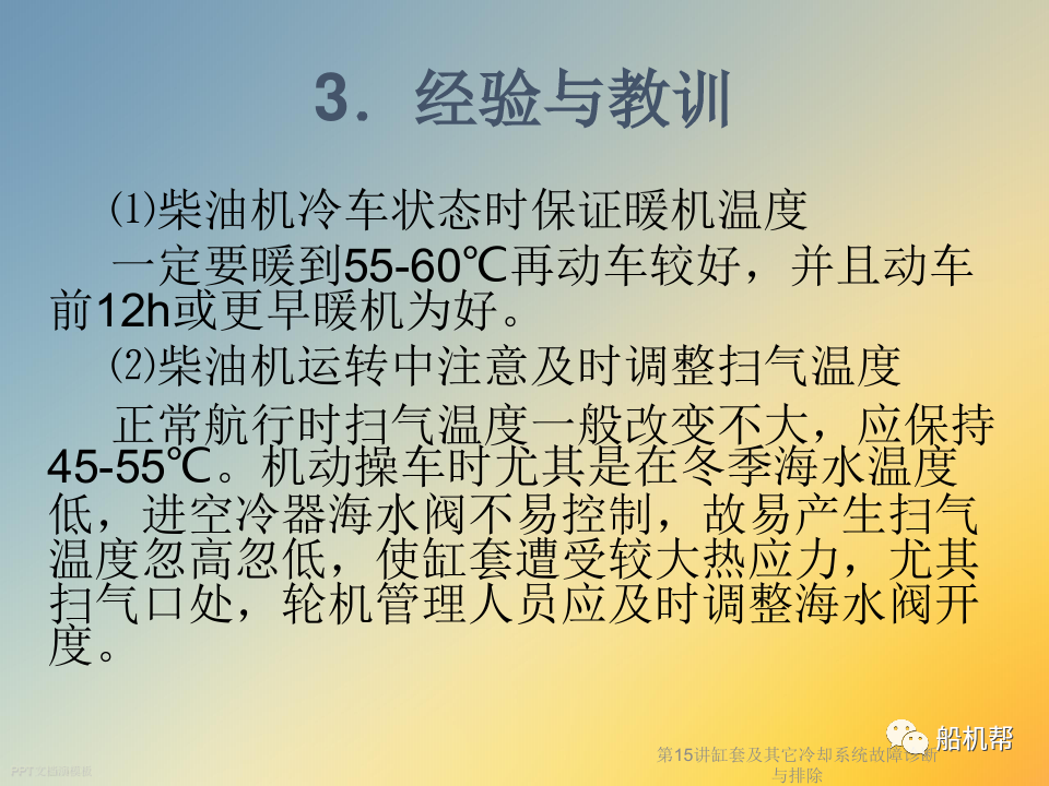勿使淡水出口温度过低(造成热损失增加、热应力增大、低温腐蚀)或过高(使缸壁滑油膜蒸发、缸壁磨损加剧、冷却腔内发生汽化、缸套密封圈迅速老化)。