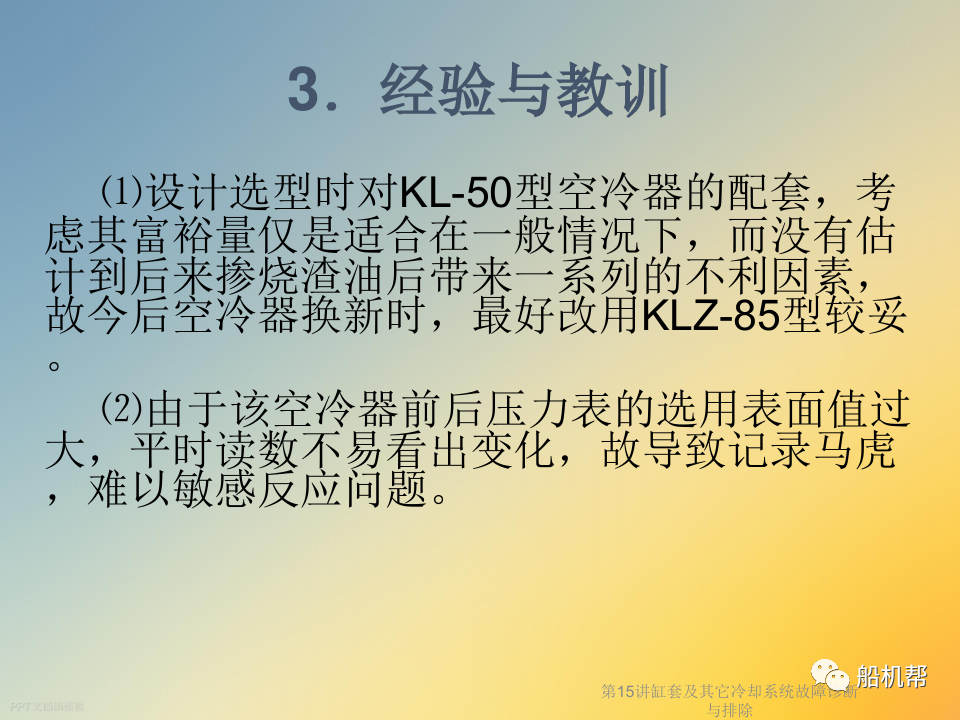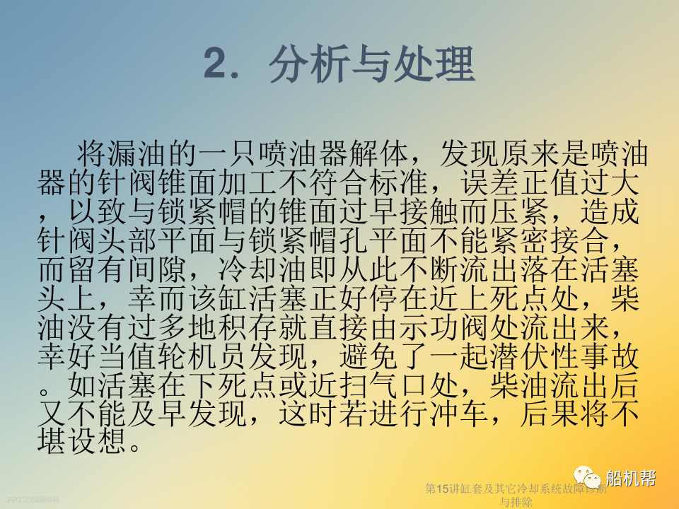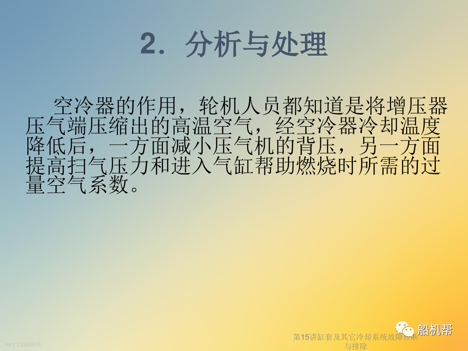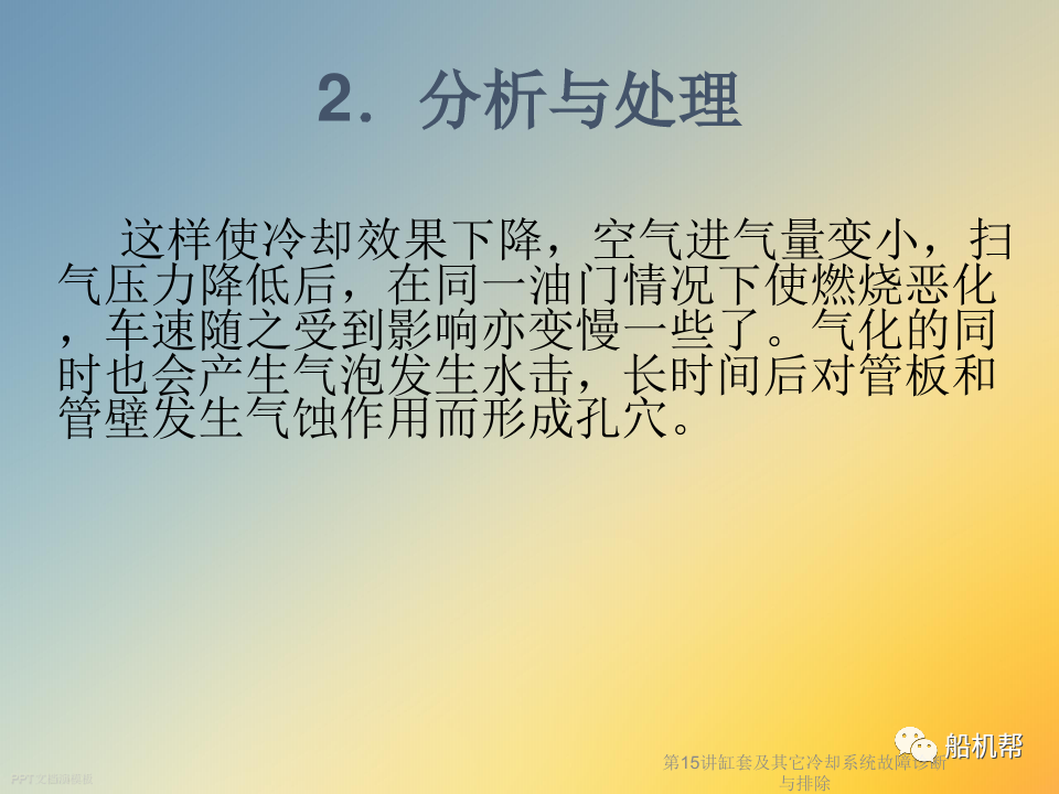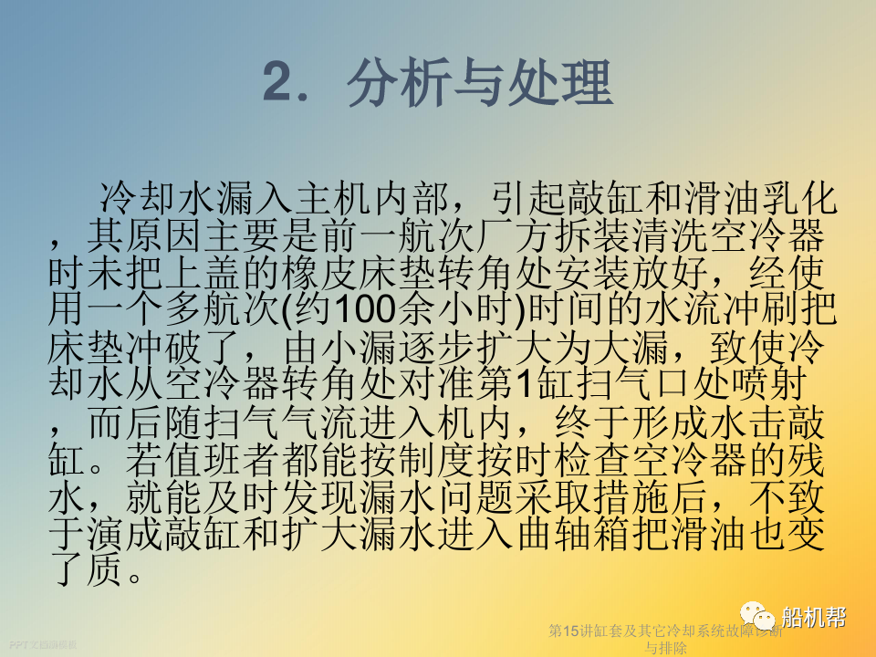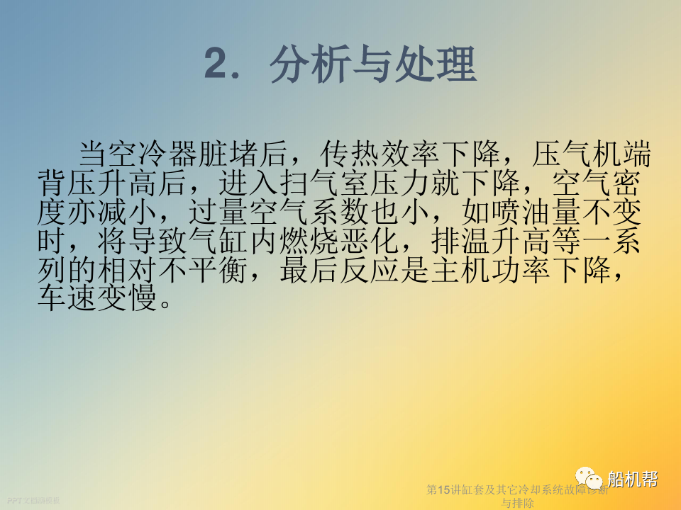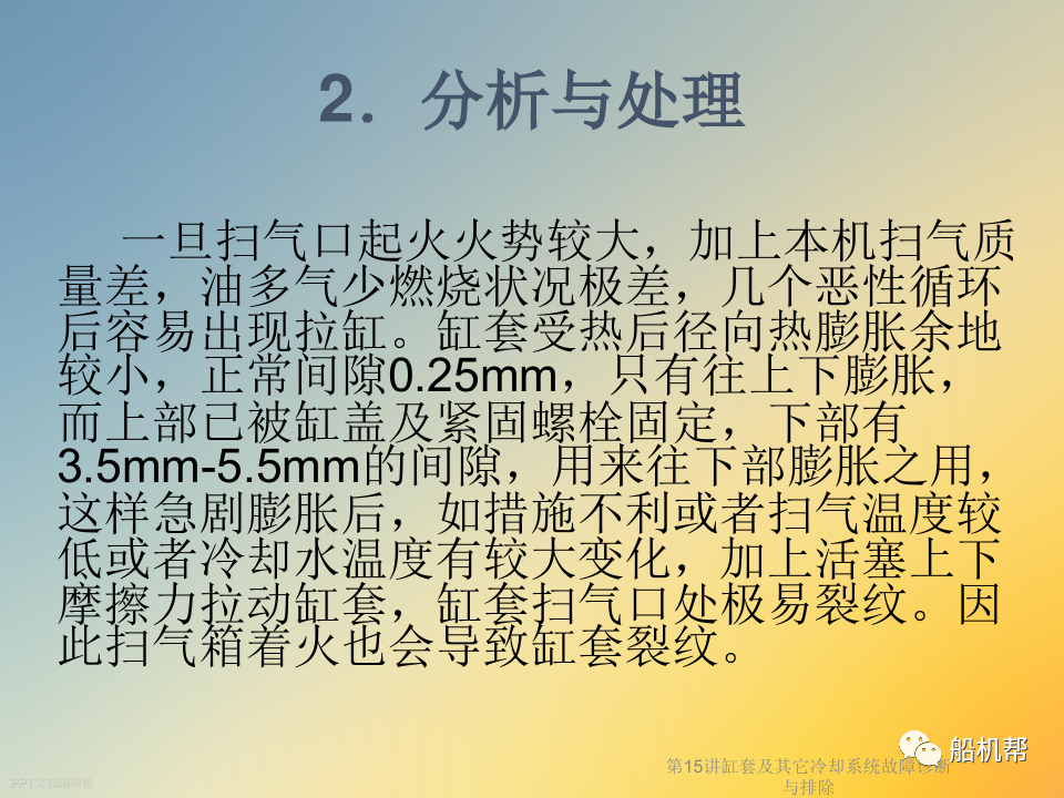 此外,冷却还可以保证运动部件如活塞与缸套的适当间隙、缸壁工作面滑油膜的正常工作状态。