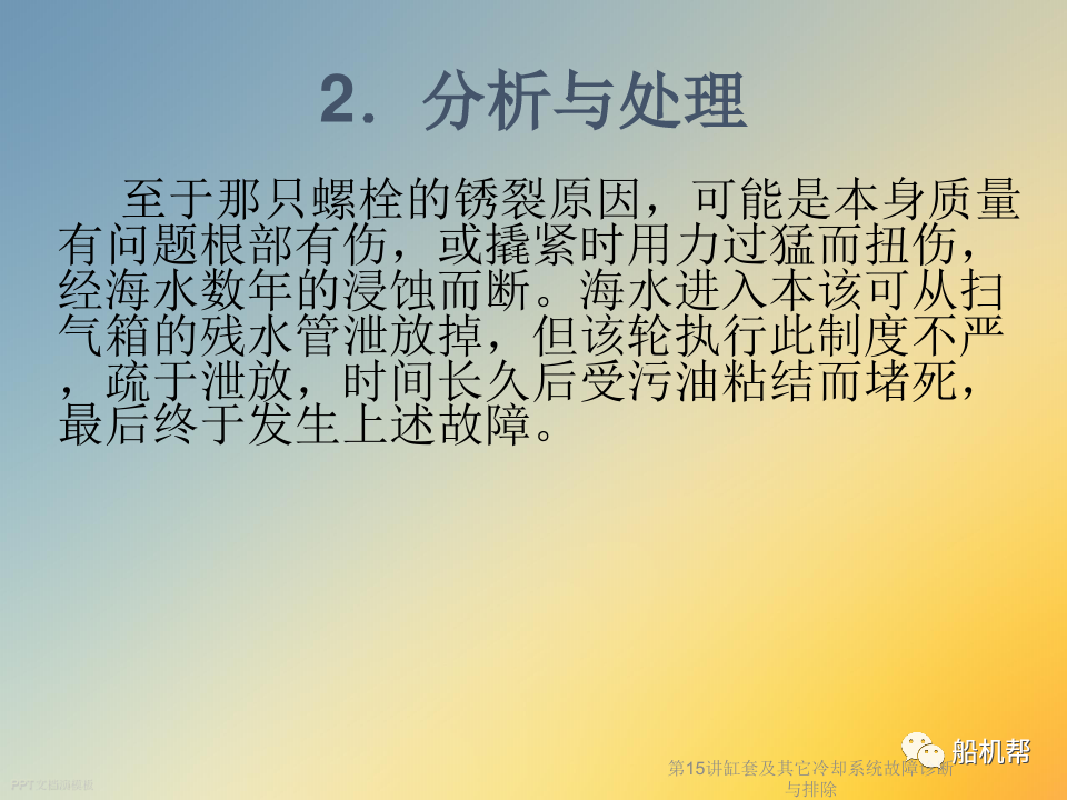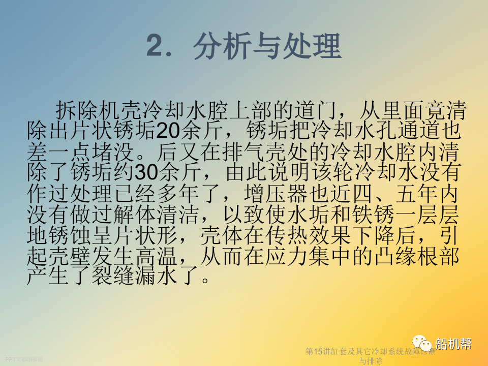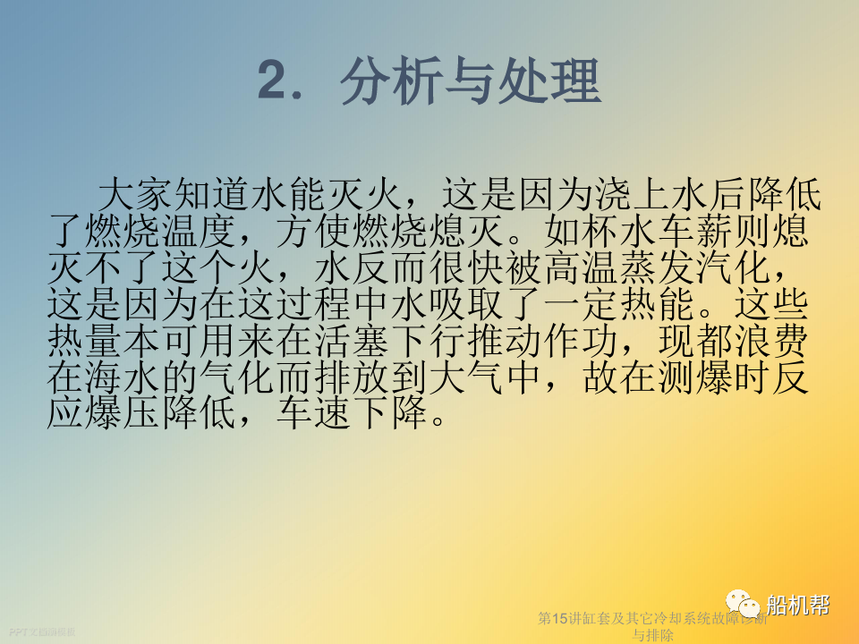 海水的水质难以控制且其腐蚀和结垢问题比较突出,为减少腐蚀和结垢应限制海水的出口温度不宜超过45℃,因而目前很少使用海水直接对柴油机进行冷却;滑油的比热小,传热效果较差,高温状态易在冷却腔内产生结焦,但它不存在因漏泄而污染曲轴箱油的危险,因而适于作为活塞的冷却介质。