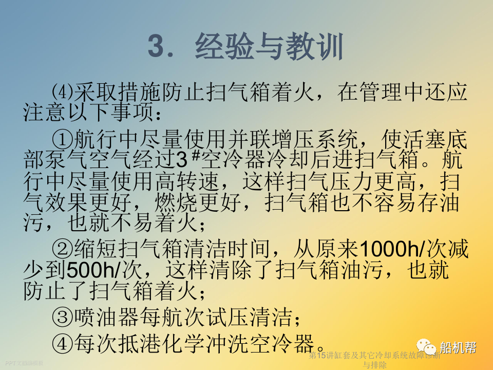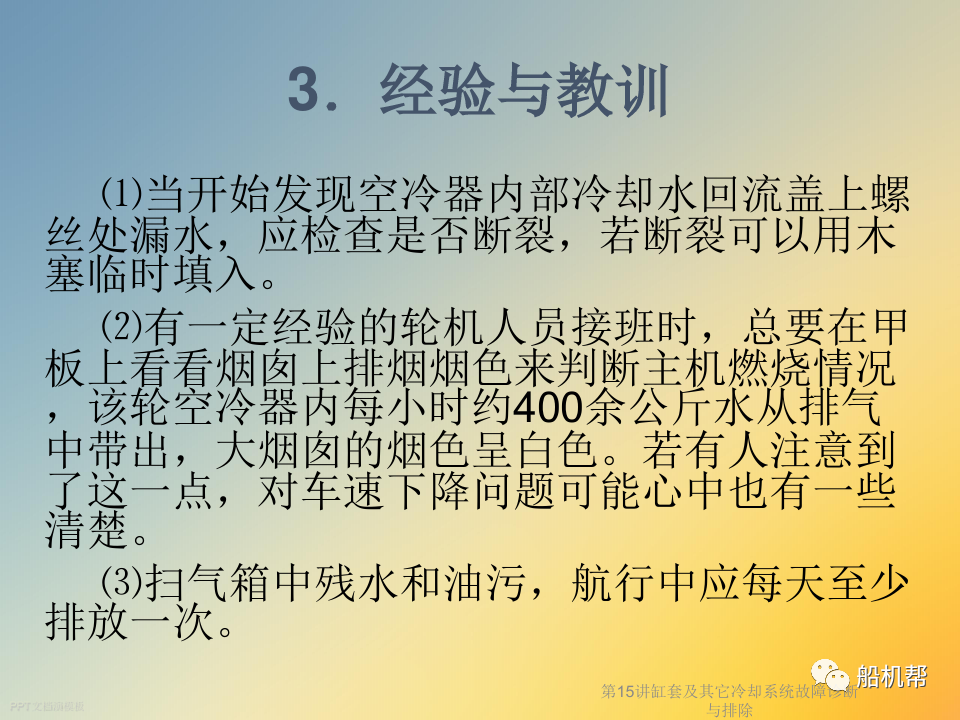 停车后,应让冷却水继续在系统内循环20min~30min,使气缸温度逐渐下降,防止缸壁表面的滑油膜蒸发或结炭,又可减少热应力。