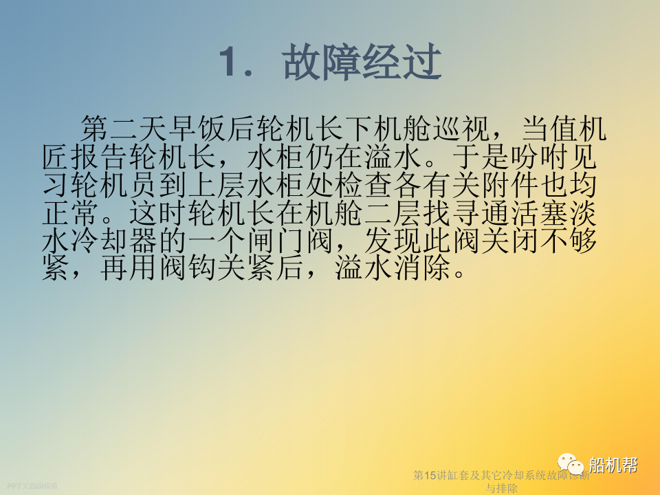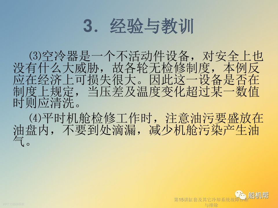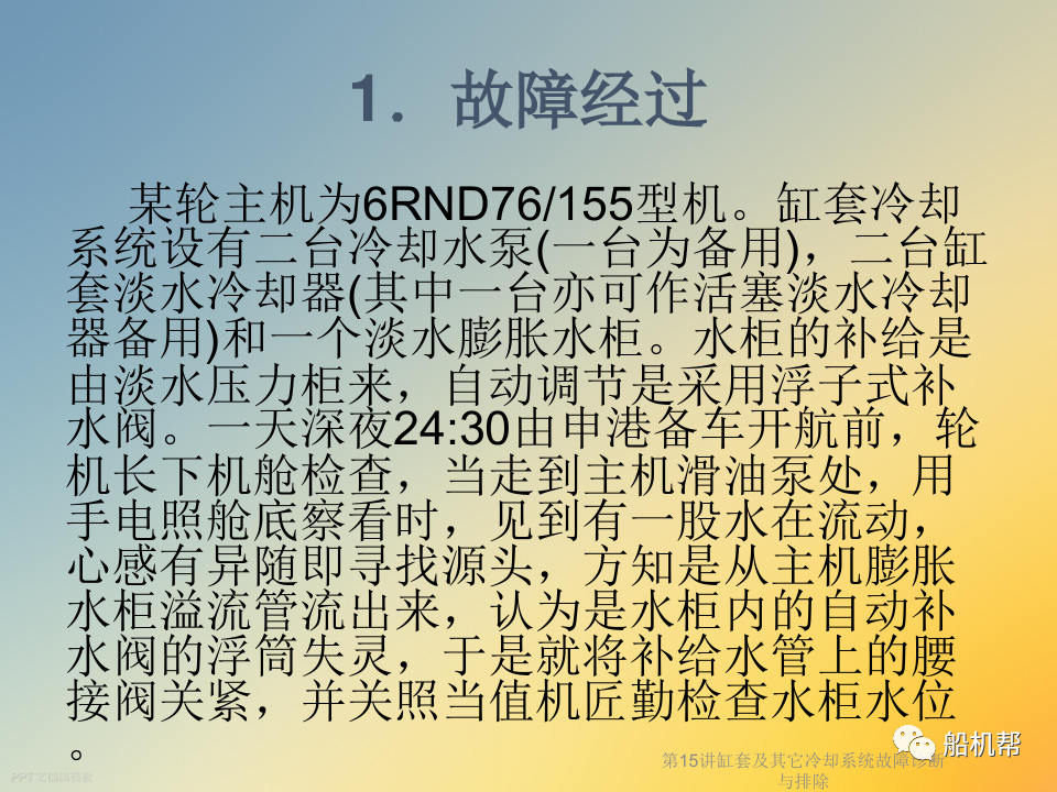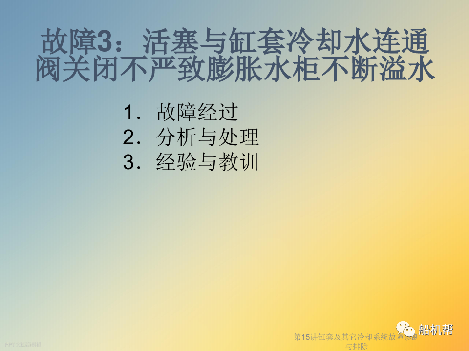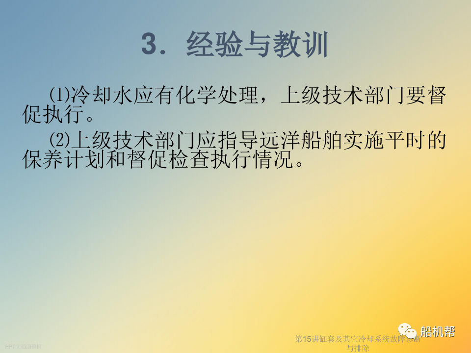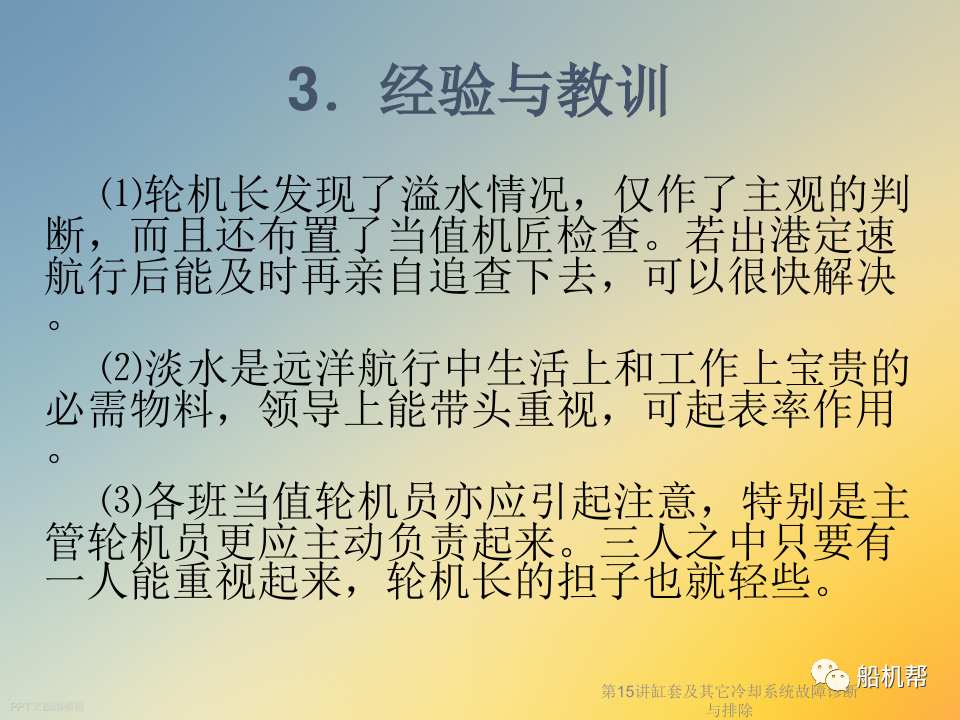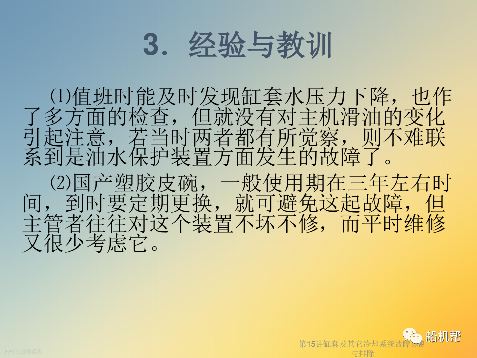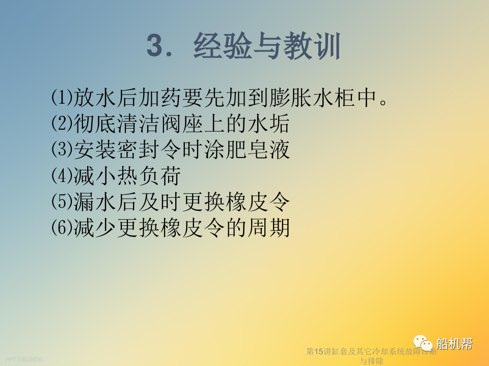 其次定期检查膨胀水箱和淡水循环柜的水位变化。