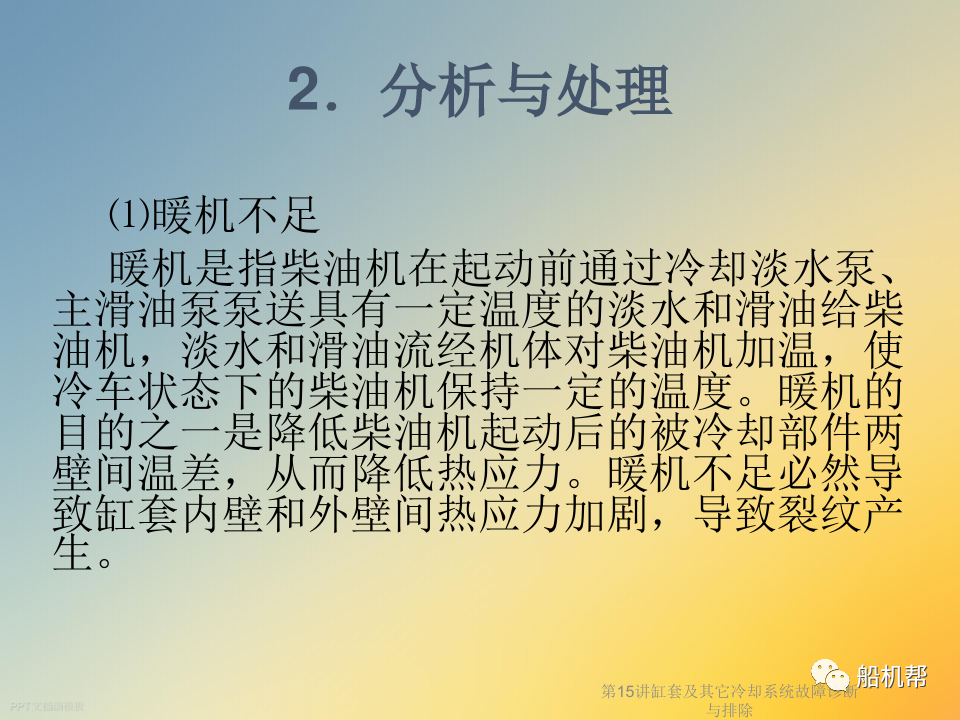 暖缸有利于缸内发火,易于起动,还可使滑油均匀布散防止缸套严重磨损,并可降低缸壁的热应力。