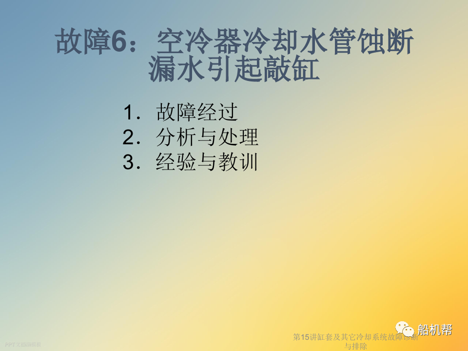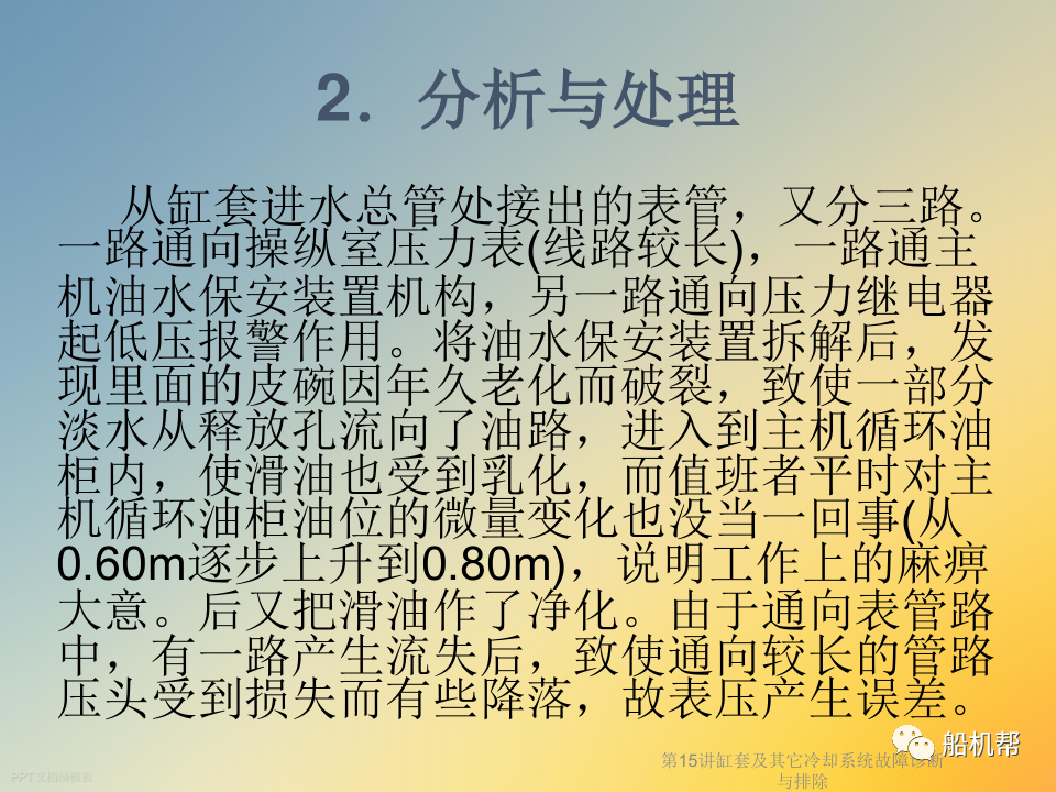 (6)当发现气缸冷却水压力波动而调节无效时,通常是由于系统中有气体存在造成,应尽快查明原因并消除。
