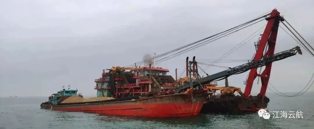 11月20日,江门台山海事处执法人员在台山沿海查处1艘内河采砂船,检查发现该船涉嫌未持有效国籍证书、配员不足、超核定航区航行等非法行为,违法情节严重,对其依法留置内河保管场。经过十多个小时的押送,该船于11月21日抵达内河保管场,等待进一步调查处理。