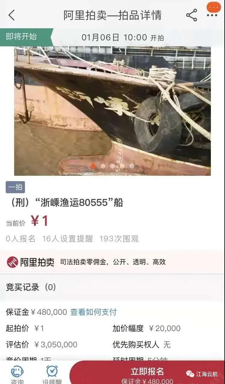 据宁波海事法院微信公众号消息,11月26日,宁波海事法院发布(2020)浙72网拍46号拍卖公告,对“浙嵊渔运80555”船一元起拍。
