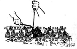 我们来顺着柴油机的工作转向盘车转动飞轮,使第一缸活塞处于压缩冲程的上止点附近;其判断方法与逐缸调整法第一步相同,在观察高压油泵第一缸油阀和第六缸油阀的供油瞬间来判定第一缸或是第六缸处于气阀进排气可调状态。(此办法建议我们用一根手指按压住第一缸或是第六缸的油阀口进行感知判定较为准确)同样是按照柴油机发货顺序(1-5-3-6-2-4)的原则在飞轮转动两圈内可按顺序完成对六个气缸的进排气阀间隙的检查和调整。