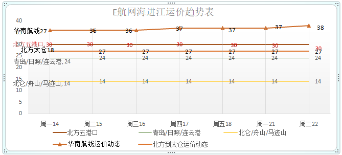 北方到太仓航线4-5万运价暂维持不变;5-5.7万吨运价暂维持不变;