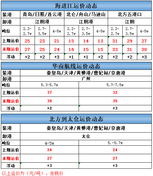 北方到太仓航线4-5万运价上涨3元;5-5.7万吨运价上涨3元;