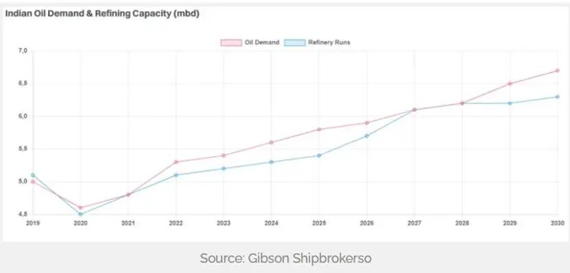 未来数月,印度对油轮市场的需求将持续攀升,涵盖成品油与原油运输。船舶经纪公司Gibson在其最新周报中指出,过去9年,印度成品油出口量年均约120万桶,基本持平。尽管同期国内炼油产能有所提升,但新增产量多用于内需。今年印度成品油出口增速已创下2021年以来新高,随着炼油能力的持续扩张,预计未来将保持增长态势。