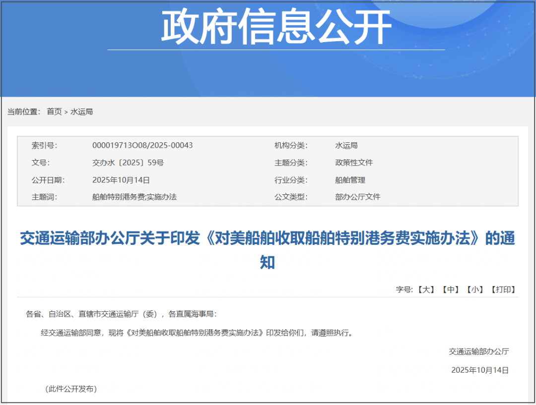 10月14日,交通运输部办公厅发布关于印发《对美船舶收取船舶特别港务费实施办法》(下称《办法》)的通知。