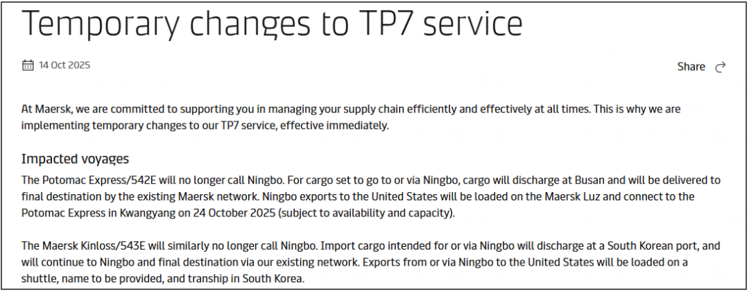 原定运往或途经宁波的货物将在釜山卸货,并通过马士基现有网络转运至最终目的地。