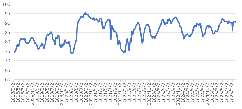 目前样本钢企高炉炼铁产能利用率89.94%,环比减少0.39%,日均铁水产量239.9万吨,环比减少1.05万吨,产量虽然小幅下降,但依旧维持在240的相对高位水平,对原材料的需求仍存。