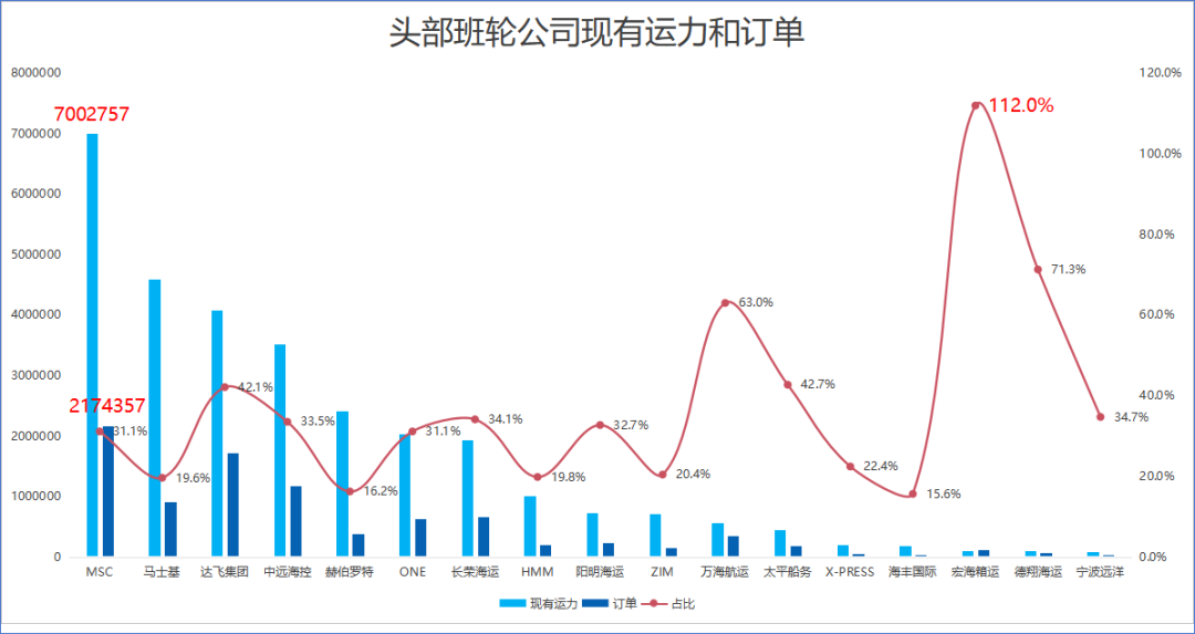 具体而言,在全球班轮公司运力100强中,地中海航运排名第1,运营955艘船,其中自有船舶688艘、租入船舶267艘,总舱位达到700.3万TEU。此外,地中海航运还持有124艘,总计217.4TEU新造集装箱船订单。与排名第2的马士基(460.3万TEU)运力差距进一步拉大到240万TEU。