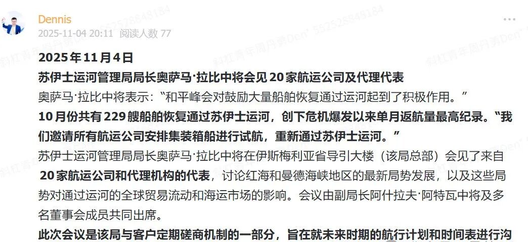 11月4日当天,苏伊士运河管理局局长奥萨马·拉比中将会见20家航运公司及代理代表。“和平峰会对鼓励大量船舶恢复通过运河起到了积极作用。”10月份共有229艘船舶恢复通过苏伊士运河,创下危机爆发以来单月返航量最高纪录。“我们邀请所有航运公司安排集装箱船进行试航,重新通过苏伊士运河。” 并对法国航运公司达飞轮船率先恢复两艘超大型集装箱船通行表示高度赞赏。