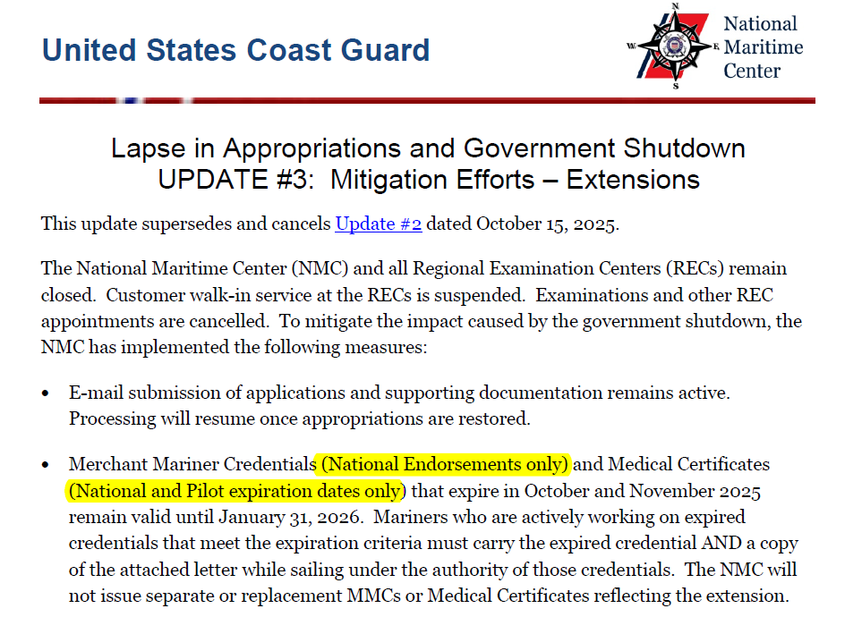 据悉,在政府停摆期间,面向公众的“非必要”服务已受到显著冲击。美国海岸警卫队的在线服务大幅缩减,其官方网站明确表示在政府恢复运转之前将“暂停管理”。对于广大商船海员而言,情况更为严峻——其地区考试中心(RECs)和国家海事中心(NMC)均已关闭,导致海员资质认证工作陷入全面停滞。