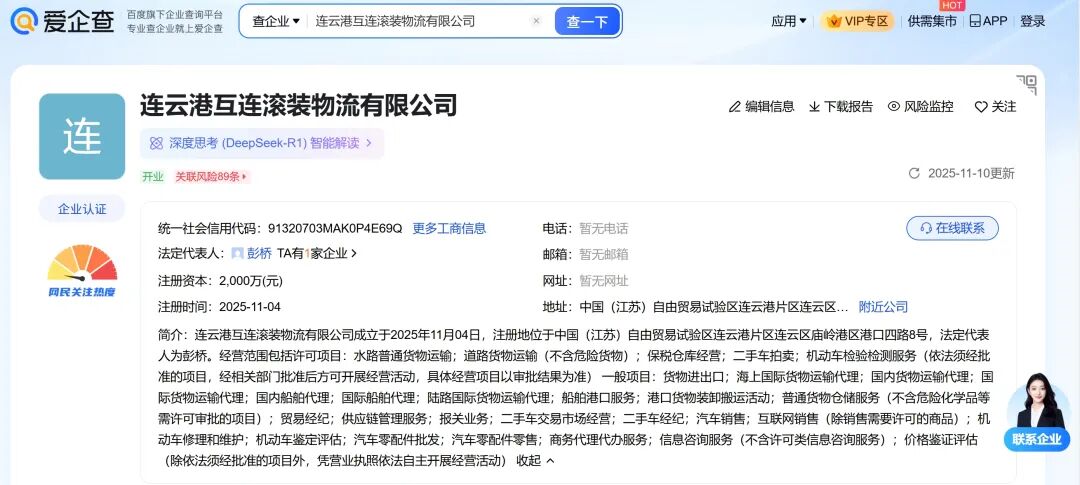爱企查信息显示,连云港互连注册资本为2000万元,连云港股份持股60%,海通码头持股40%,经营范围包含水路普通货物运输,道路货物运输(不含危险货物),保税仓库经营,国际、国内船舶代理,海上国际货物运输代理,国内货物运输代理,船舶港口服务,供应链管理服务等。