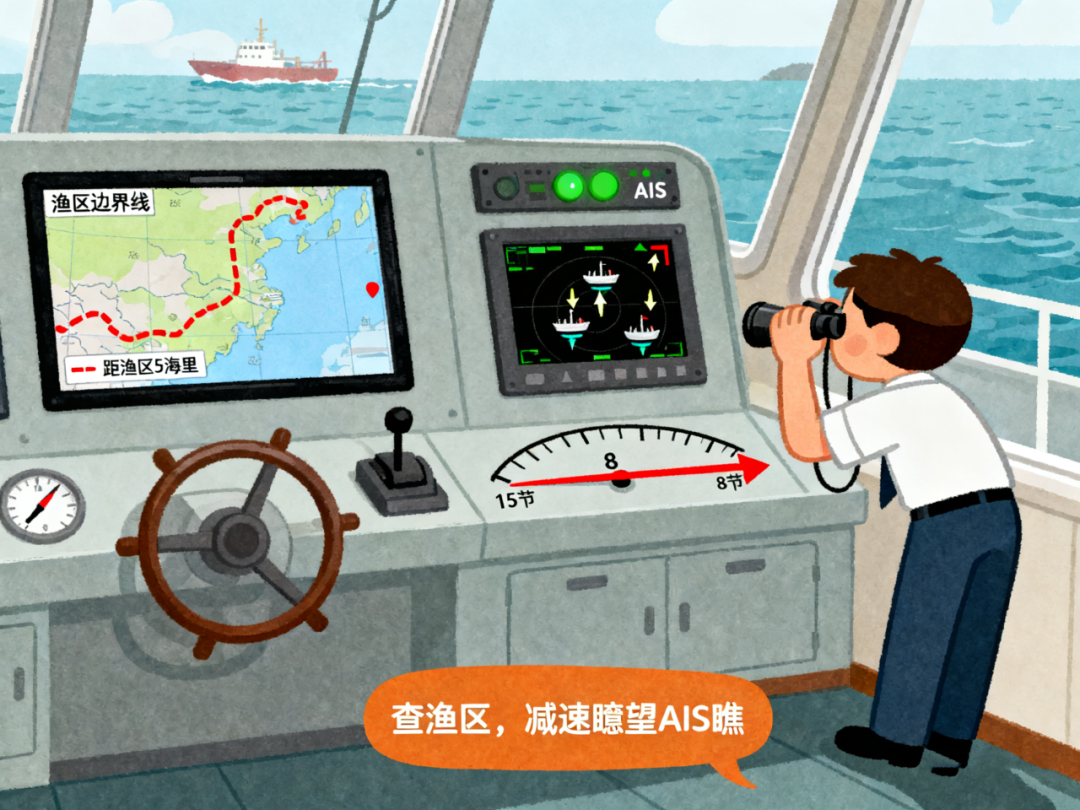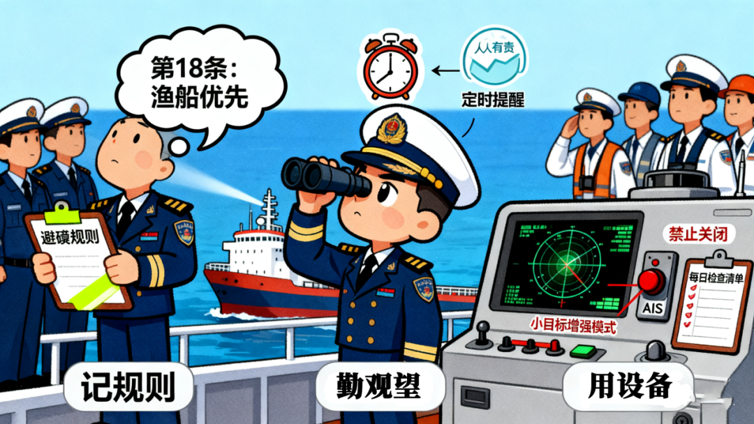 •把“规则”刻进心里:熟记《1972年国际海上避碰规则》避让要求,渔船不抱“商船必须让我”的侥幸心理,主动做好避让准备。