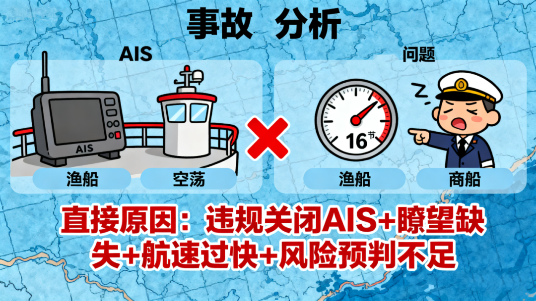 • 直接原因:渔船违规关闭AIS、瞭望缺失;商船瞭望疏忽、航速过快,未对渔区风险提前预判。