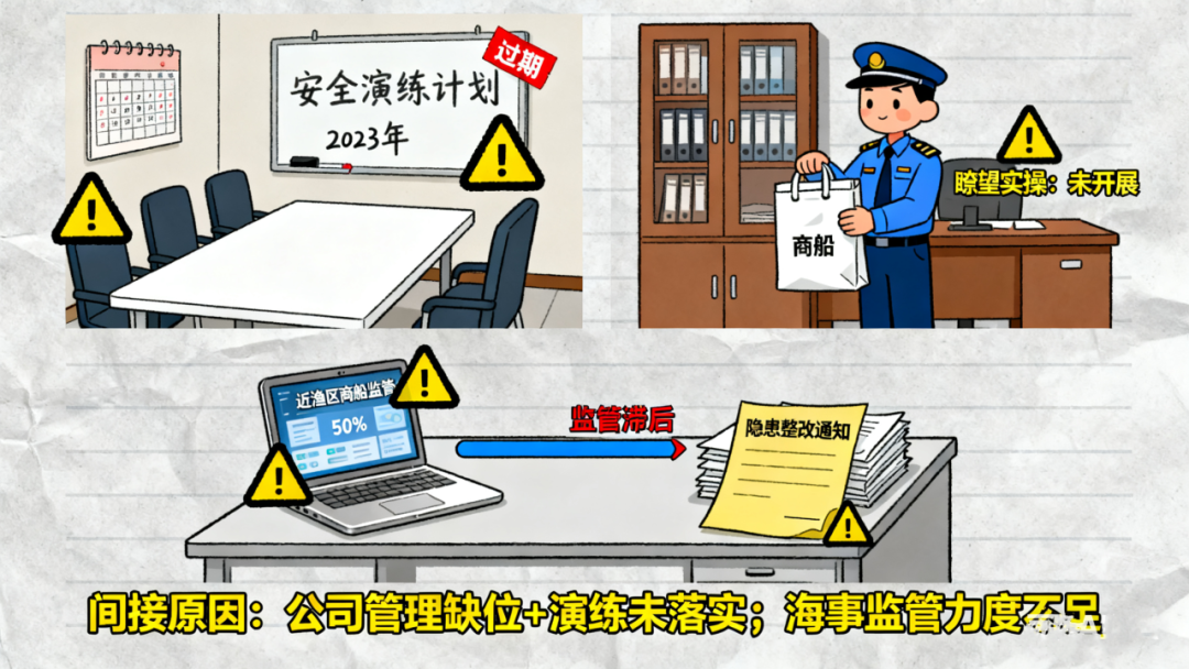 • 直接原因:渔船瞭望完全缺失、未显示作业信号;商船过度依赖雷达,目视瞭望不足,未及时发现渔船。