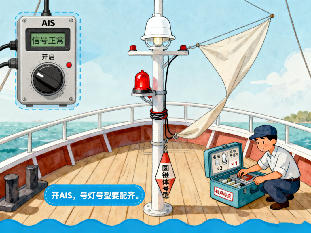 开航前(渔船):开启AIS并保持正常,检查号灯、号型完好并配齐,作业时正确显示;
