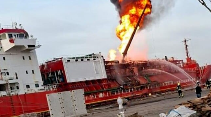 这艘土耳其籍船只“奥林达(Orinda)”号;当时正停靠在伊兹梅尔港卸载液化石油气货物,16名船员安全撤离。乌克兰消防员正在努力扑灭大火。