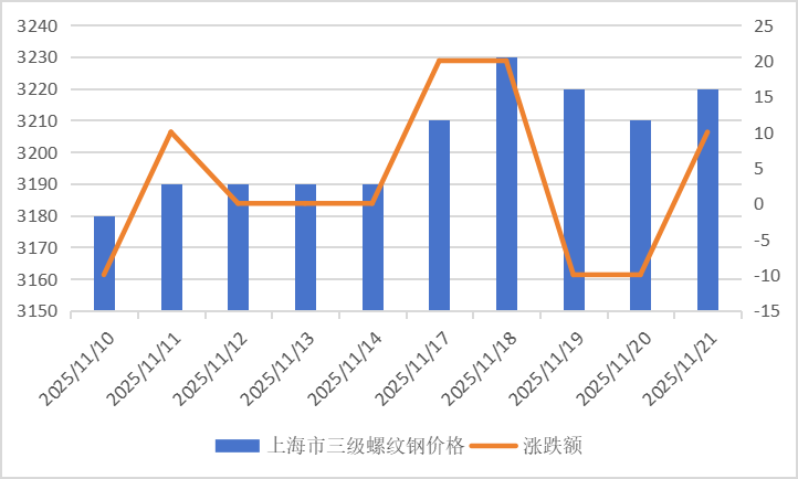 上海市三级螺纹钢价格在3210-3230元/吨的极窄区间内波动,周一、二连续两日小幅上涨20元,累计至周内高点3230元,周三、四价格未能守住涨幅,连续两日各下跌10元,回落至3210元,周五在连跌两日后小幅反弹10元,收于3220元。当价格跌近3210元低位时,钢企的原料成本形成“地板”,阻止其进一步下跌,而价格上涨时,下游接受度低,采购方按需购买,导致价格无力突破上行。