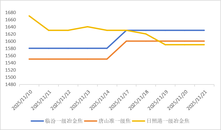 四轮提涨后焦企利润略有修复,多数维持正常生产,厂内库存保持低位,焦炭主产地价格全周走平,临汾一级冶金焦稳定在1630元/吨,唐山准一级焦稳定在1600元/吨。日照港一级冶金焦价格呈现先抑后稳的态势,在17到18日的连续下跌之后保持稳定,港口价格走弱且与产地出现“倒挂”,贸易商对后市并不看好。