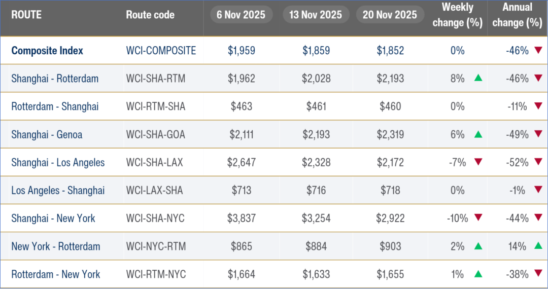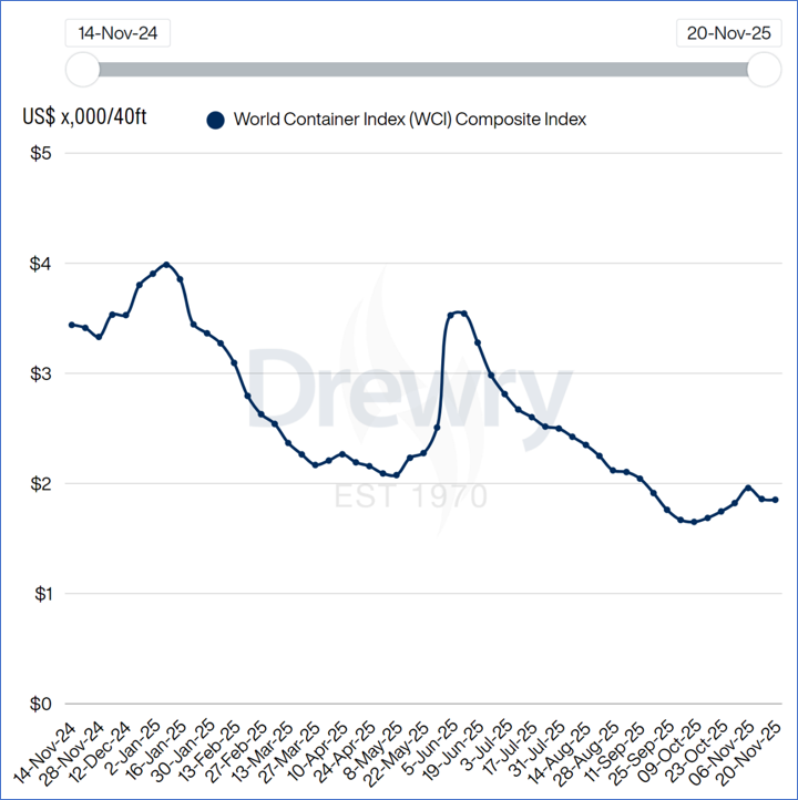 与此同时,截至11月20日,Drewry世界集装箱运价指数(WCI)稳定在1852美元/FEU。跨太平洋航线运价下跌,亚欧航线运价上涨,从而形成了对冲。
