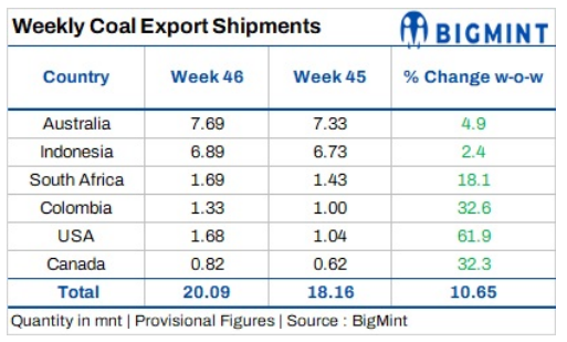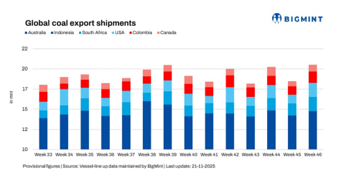 据BigMint 11月21日发布的信息,其整理的船舶运输跟踪数据显示,2025年第46周(11月8日至14日),全球海运煤炭出口量合计达到2009万吨,高于第45周(11月1日至7日)的1816万吨,环比增长10.6%。
