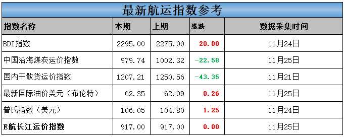 下水货盘需求较之前有所增加。沿江主力电厂冬储煤还在继续,需求开始增加;长江内河货源补充有所改善,非电领域建材、化工等行业受终端需求也有增加,运价也受到支撑上涨。后期需重点关注枯水期水位变化对船舶实际载重的持续影响。