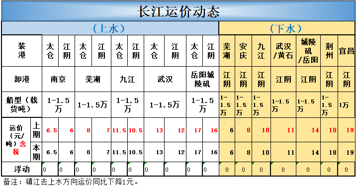 北方五港方向进江小船运价下跌1元,大中型船运价均下跌2元。